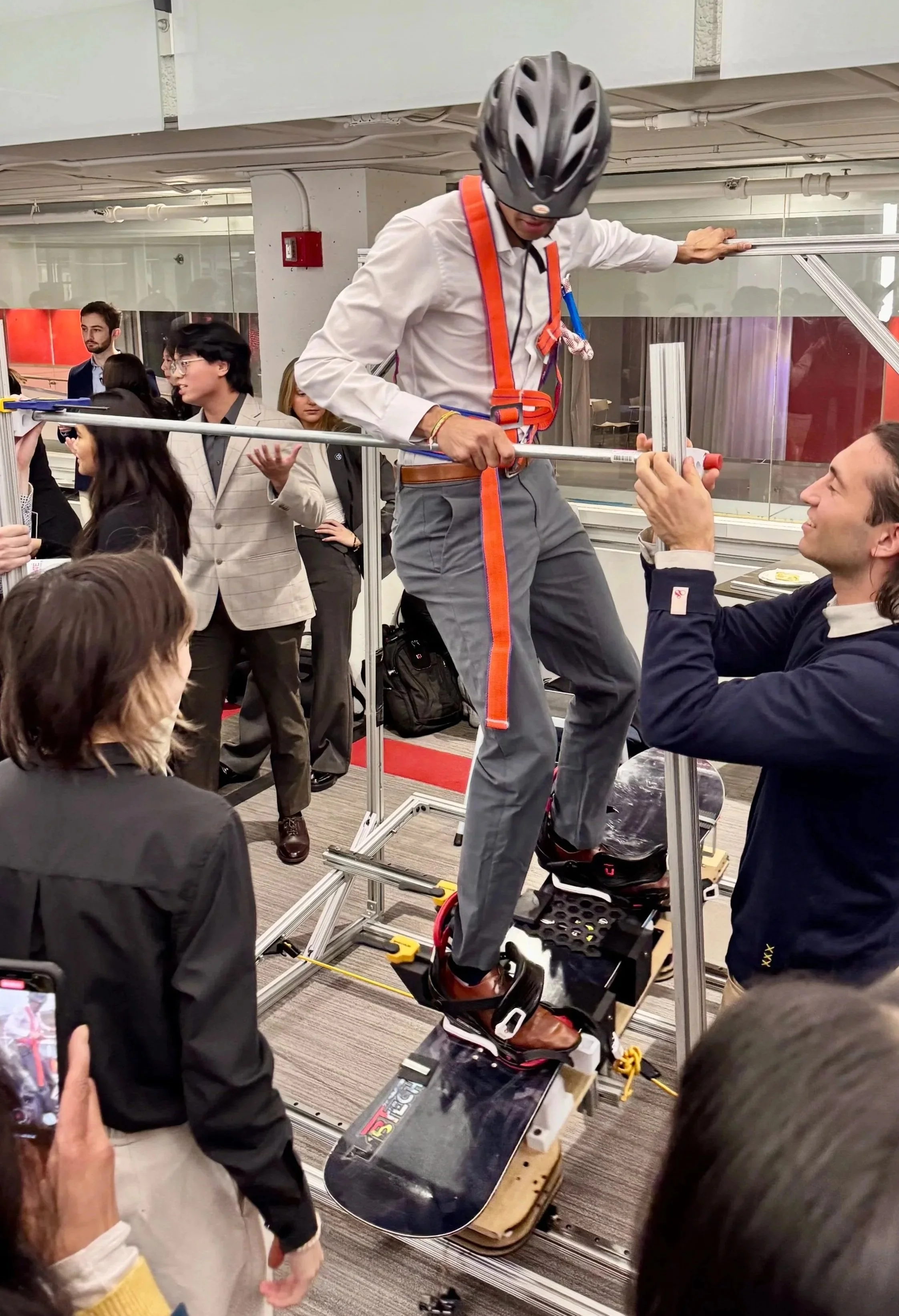 I was responsible for leading the development of the roll axis subsystem, incorporating precision springs and hard stops to emulate carving angles, as well as integrating load cell contacts into the mounting platform to measure user force distribution. I also contributed to the design of adjustable, non-compressive clamps with a magnetic guidance system, enabling secure attachment of the user’s snowboard without compromising sensor accuracy. By focusing on safety, manufacturability, and user experience, we delivered a functional prototype with a harness, clamping system, and stability bar that allows users to confidently train year-round while receiving accurate feedback on their riding performance.